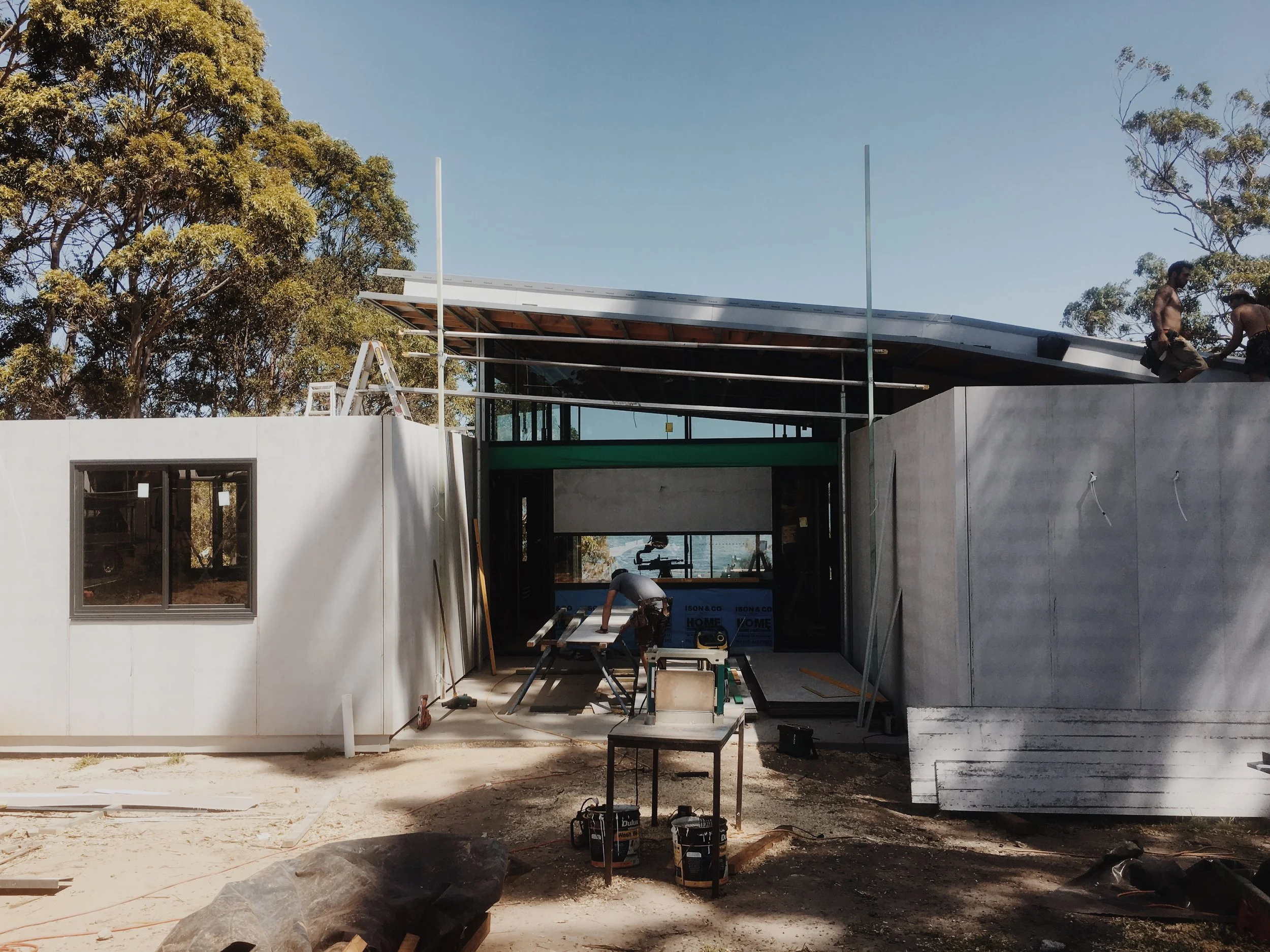 Tarpaulin House at Basin View is taking shape with the cladding nearing completion and windows and doors installed. Slowly a sense of the tarp spanning the central living area and allowing glimpses of the estuary emerges…